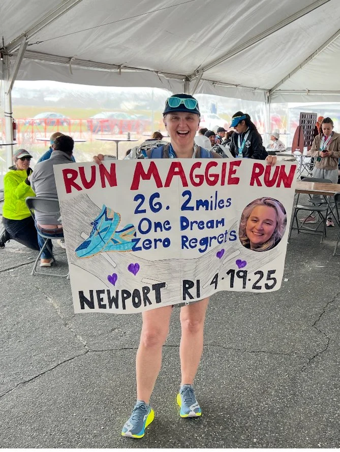 “My crew.” Maggie ran her first marathon with Coach D and while her kids are grown and out of the house she is still MOM. Her kids got to see her chase her dreams of being a marathoner, coming out in the rain to cheer her on to the finish line. Never stop dreaming, your kids are always watching.